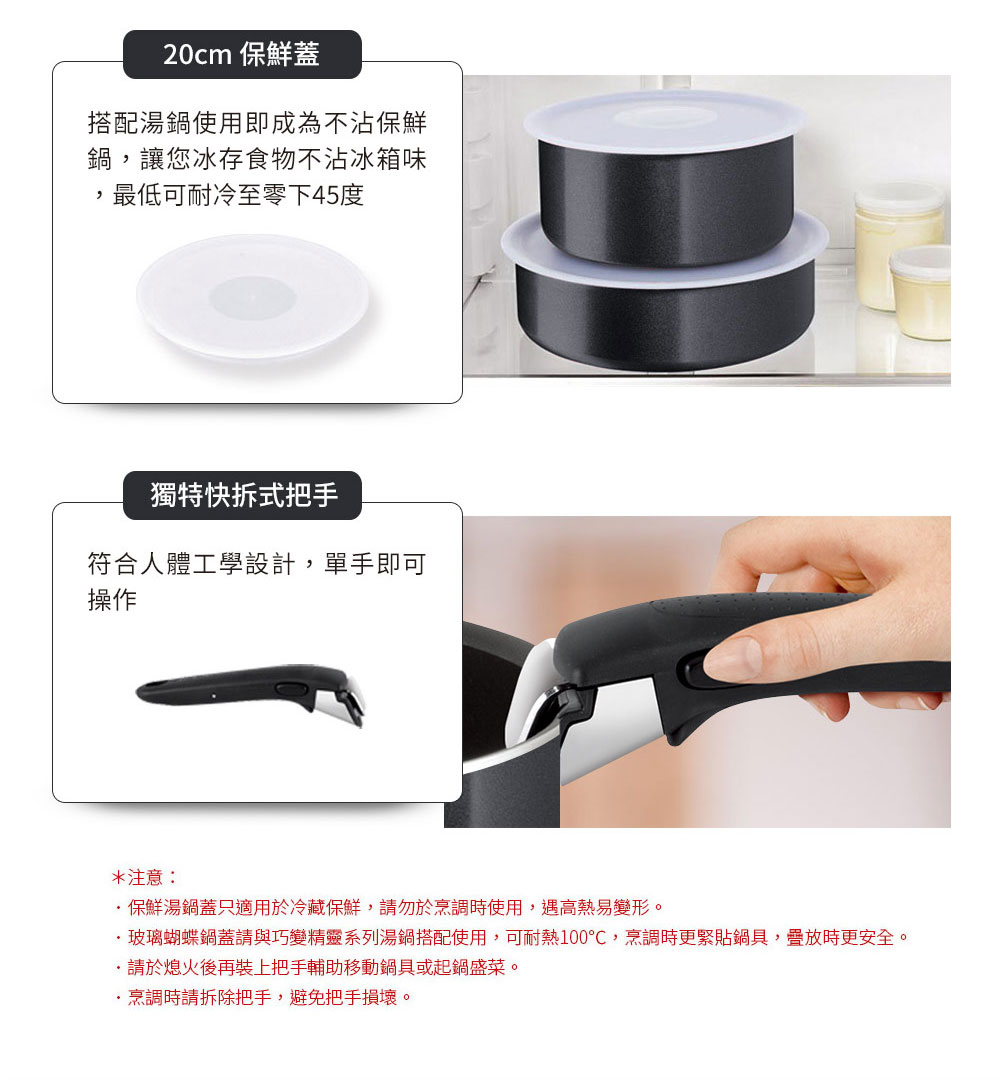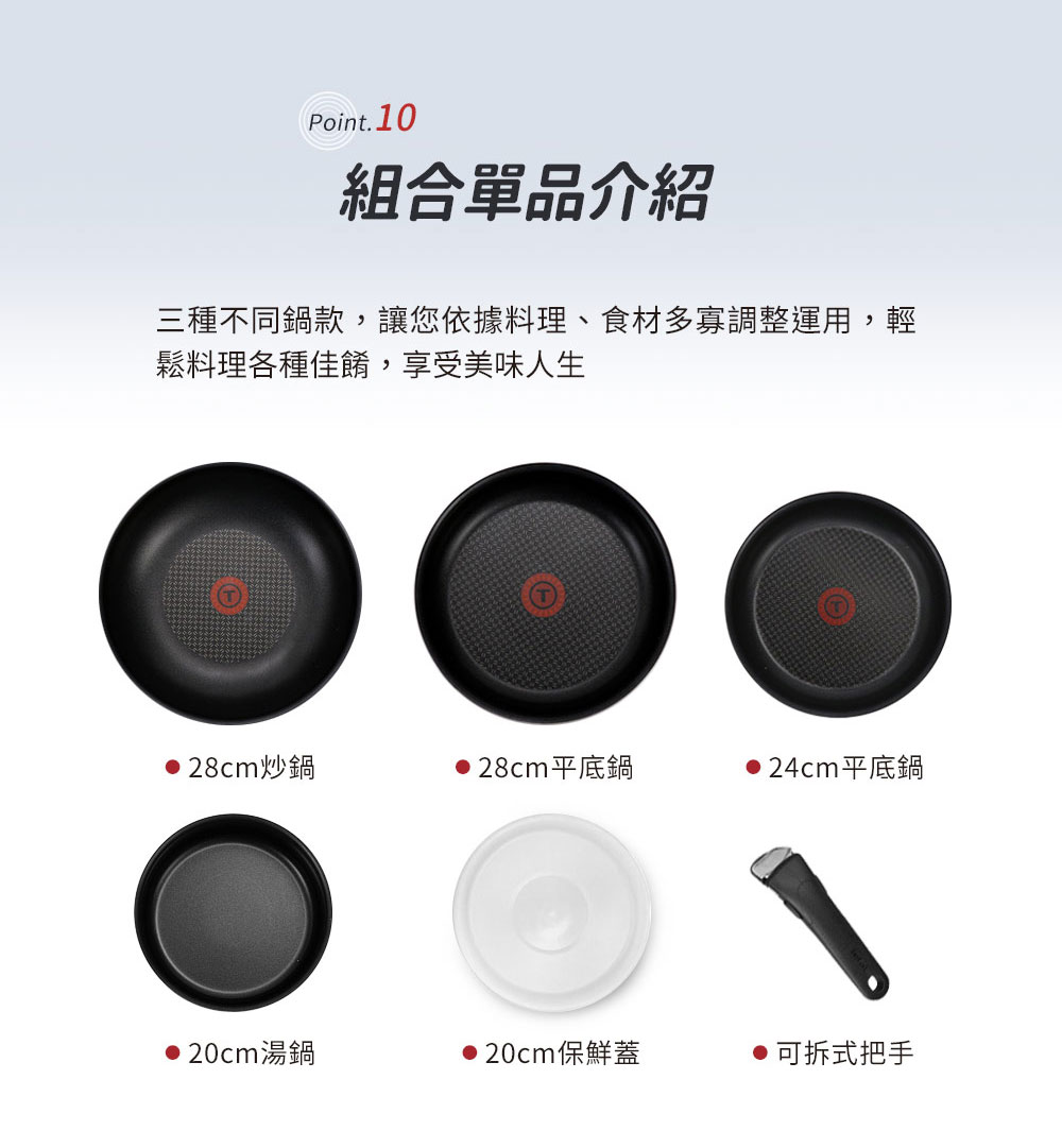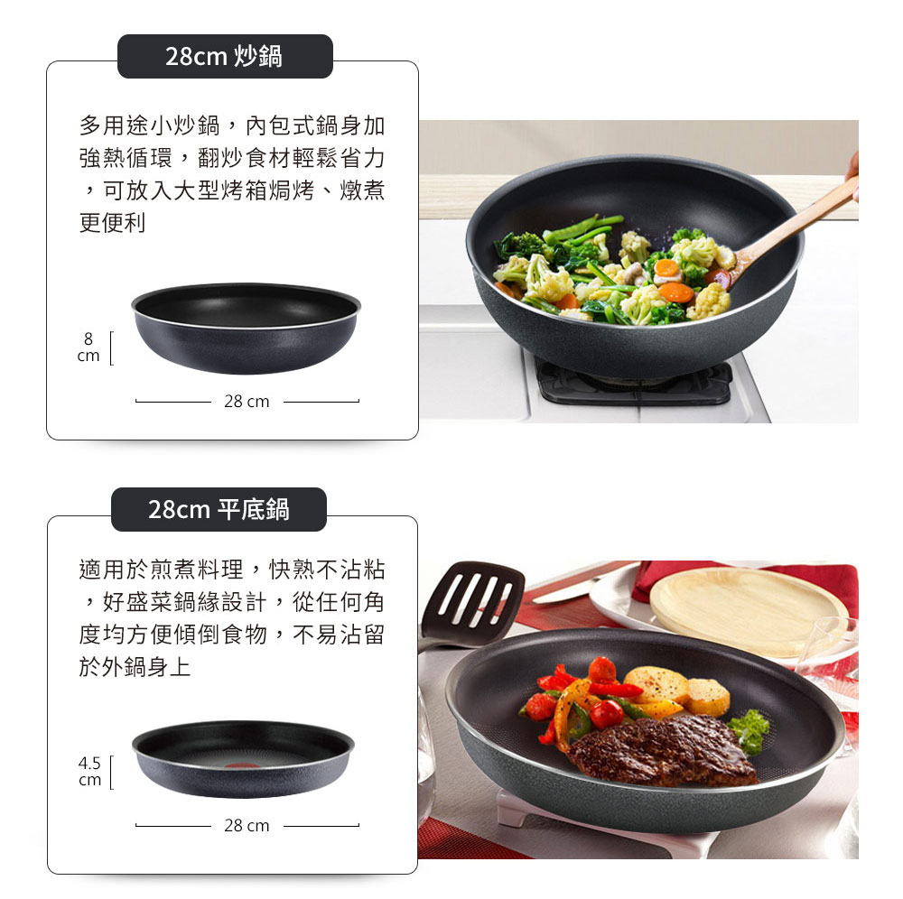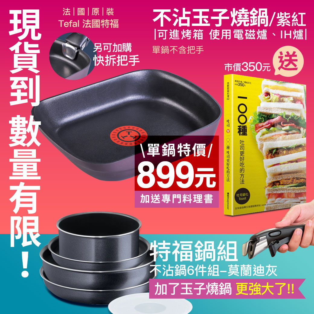 28cm平底鍋x1+24cm平底鍋x1+28cm炒鍋x1+20cm湯鍋x1+20cm保鮮蓋x1+可拆式把手x1法國特福巧變精靈系列不沾玉子燒鍋-紫紅(IH)
