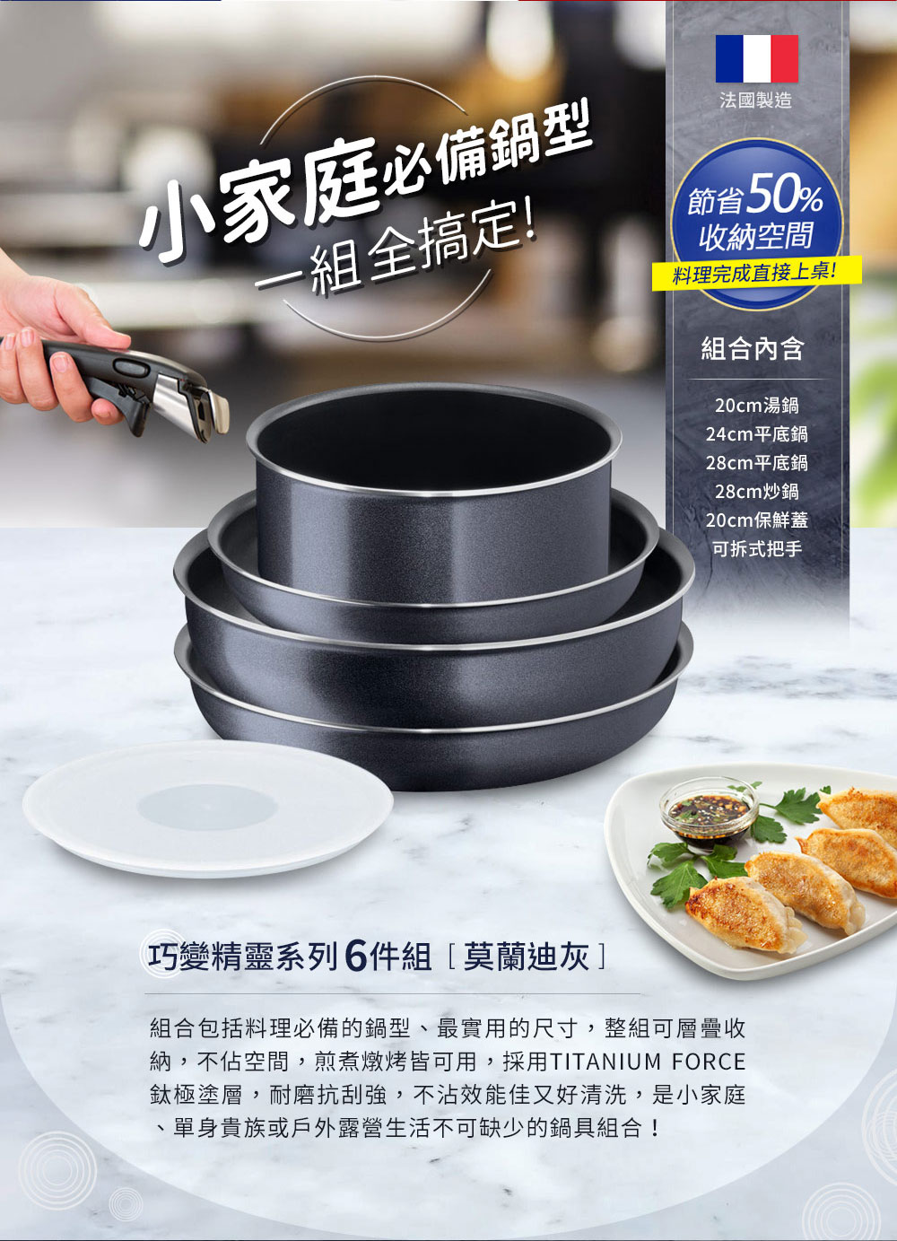 品名:Tefal法國特福 巧變精靈系列不沾鍋6件組-莫蘭迪灰鑑賞期非試用期