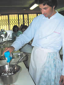 杜林帥哥主廚的帽子布丁 偶然的機會裡,認識了這位杜林的帥哥主廚。杜林(Torino)是位在義大利北方皮耶蒙特省(Piemonte)靠近法國的城市,是地緣和歷史的因素使得杜林成為義大利最具法國風味的城市。街道巷弄、建築、生活、文化無一不與法國沾上邊的。杜林的帥哥主廚引領我們來到他的餐廳Farfouie,他大顯身手親自下廚為我們示範義式布丁Bonet的做法。 或許嚴格說起來,稱之為杜林布丁較為恰當,因為Bonet是杜林特有的甜點。Bonet這個字來自杜林的方言,是帽子的意思,是以中古世紀當時人們頭戴的帽子的形狀而命名。在帥哥主廚起身從烤箱中拿出剛出爐的布丁前,我們早已被他精湛的手藝與四溢的香氣給催眠了。不過,最令人為之瘋狂的當然還是Bonet獨特的口味讓人大飽口福。Bonet含有少許的烈酒,因此布丁顯得略為濕稠,近似蛋糕的綿綿口感,使它濃郁的巧克力風味更加出色。Bonet真不愧為杜林的特產,這種兼具法式浪漫與義式熱情的甜點大概也只有杜林才有了! |