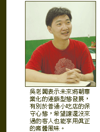 不論是製醬方法、煮麵技術、外場運作等,吳老闆都竭盡心力統籌分工,以商品差異化朝專業的連鎖型態發展為目標,不同於一般小吃店的保守心態,從員工上下一心、各司其職看來,馬祖麵店積極拓展商圈的規劃,正蘊釀另一波消費熱潮。
