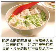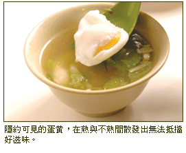 製作蛋包的技術,不是人人都熟悉的,必須經由訓練過的師父將生蛋打入滾燙沸水中,其中要領是生蛋不能破,約莫1分鐘後,小心翼翼撈起七至八分熟如黃金般的蛋,放入低溫冷水中,蛋黃在熟與不熟間隱約散發出無比好滋味,令人無法抵擋。除了高超的技術,完美的蛋包,另一項取決因素在於蛋的新鮮與否,故務必格外小心選購,因店內對蛋的使用量大,每天採購不囤積,為新鮮掛保證。