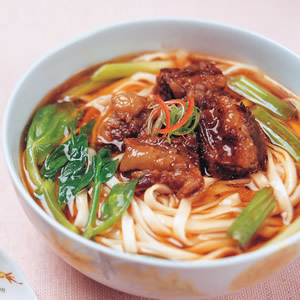 紅燒牛肉麵可說是大家對牛肉麵的第一印象,這也是牛肉麵最基本的口味,所以不論大街小巷的牛肉麵館,菜單上幾乎都會有「紅燒牛肉麵」這五個字;紅燒牛肉麵最講究的就是香辣濃醇而且黑不見底的湯頭,主要是用蔥、薑、辣椒醬、醬油、牛骨等材料,再加上被各家老闆視為商業機密的中藥滷包熬製八小時而成的,喝起來完全不帶有一絲牛腥味;至於牛肉則大都採用略帶膠質的腱子肉,切成大小適中的肉塊,加以汆燙過後與蔥、薑、蒜一起下油鍋爆香,為了使牛肉上色並且產生辣味,則加入辣豆瓣醬及醬油拌炒,然後加入米酒去腥提味,接著再放入牛肉湯中燉煮二個小時,這樣牛肉吃起來香氣十足,而且軟而不爛更具有口感,再搭配上香Q有勁的刀削麵或拉麵及去油解膩的酸菜一起食用,真是再適合也不過了!
